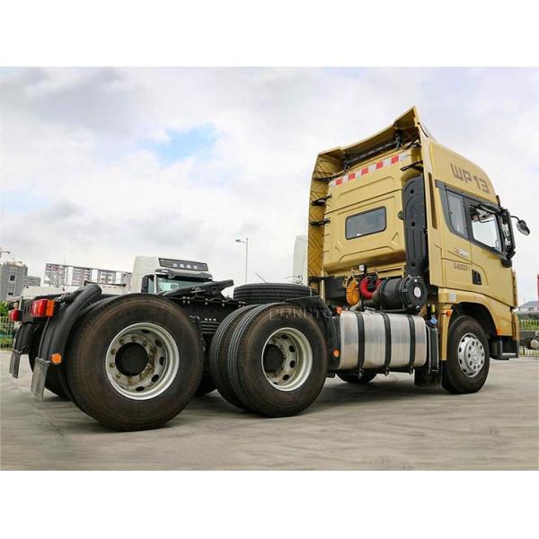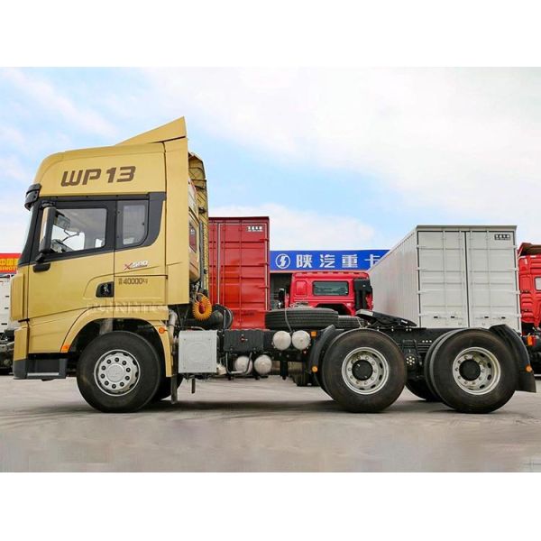 X3000 6x4 tractor is equipped with a Weichai 12.5-liter engine in terms of power, which complies with China VI emissions and can output a maximum of 480 horsepower. It is matched with a Faust 12 speed gearbox, an overdrive design, and is equipped with a synchronizer; In terms of chassis, it adopts an 11.5-ton rear axle with a speed ratio of 3.7, and the suspension adopts a front 2 and rear 3 less leaf spring design; The fuel tank and urea tank are integrated on the left side of the frame. The aluminum alloy dual fuel tank has a capacity of 1000 liters and strong endurance, further reducing the self weight.
